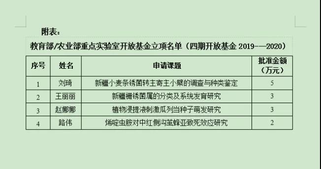 日前,从南京农业大学植物保护FOG电竞 传来喜讯,新疆农业大学FOG电竞 刘琦、王丽丽、赵娜娜、路伟4位青年教师获得教育部农作物生物灾害综合治理重点实验室/农业部华东作物有害生物综合治理重点实验室开放基金资助(具体详情见附表)。