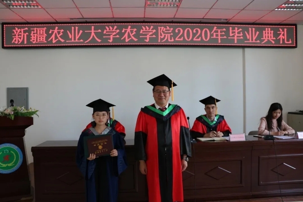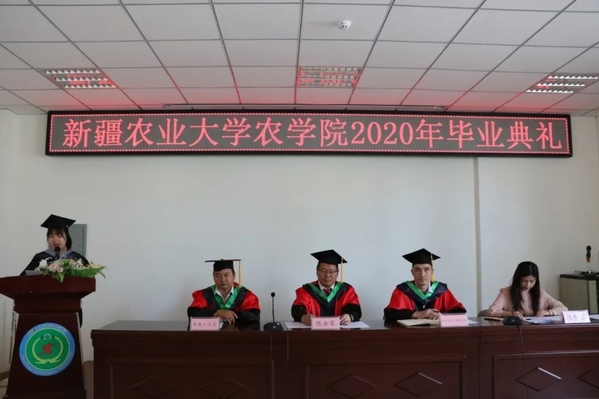 活动伊始,参与此次毕业典礼的老师和毕业生代表共同观看新疆农业大学2020年毕业典礼转播。