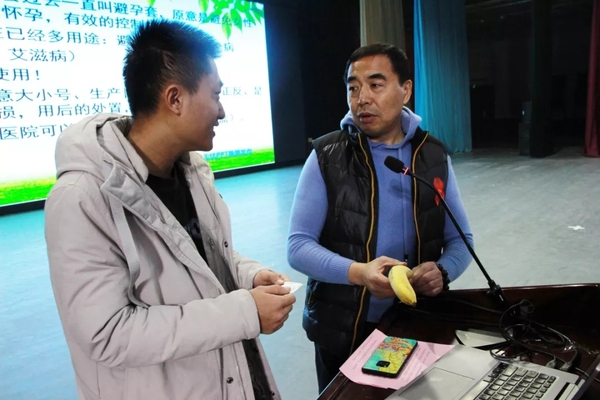 李殿彪也和学生们进行了现场互动。通过现场操作向学生们展示了如何正确使用安全套和如何使用检测艾滋病的药物。同时向大家提出要求,要树立正确的性道德观,遵守社会道德,掌握科学的性知识,预防艾滋病的发生与传播。