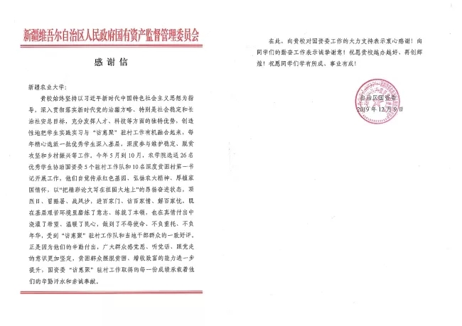 近日,自治区国资委向我校发来感谢信,感谢我校实习生协助国资委5个“访惠聚”驻村工作队和10名深度贫困村第一书记开展工作,赞扬他们顶烈日、冒酷暑、战风沙,进百家门、访百家情、解百家忧,自觉传承红色基因、弘扬农大精神、厚植家国情怀,把精彩论文写在祖国大地上,他们是全体农大人的骄傲!