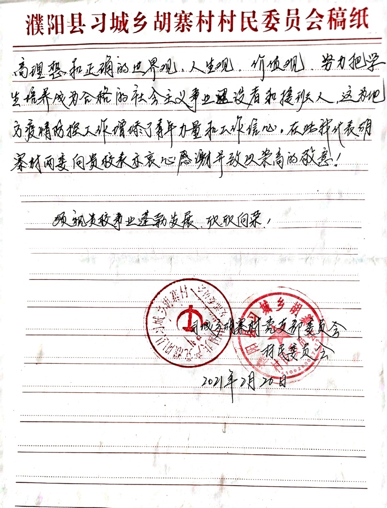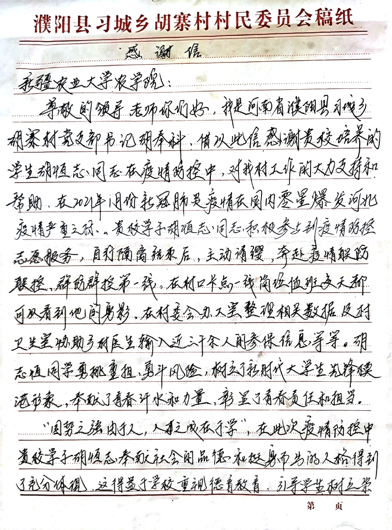 近日,FOG电竞 收到了一封来自河南省濮阳县习城乡胡寨村村委会所写的感谢信,对FOG电竞 胡恒志同学在抗击疫情志愿者服务中所做出的贡献给予了高度赞扬。胡恒志同学为FOG电竞 2020级资源利用与植物保护专业硕士研究生,同时担任FOG电竞 研究生分会副主席。